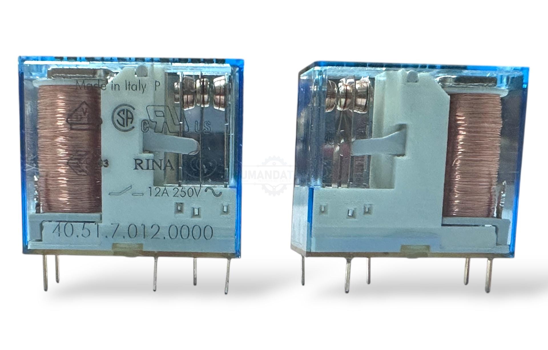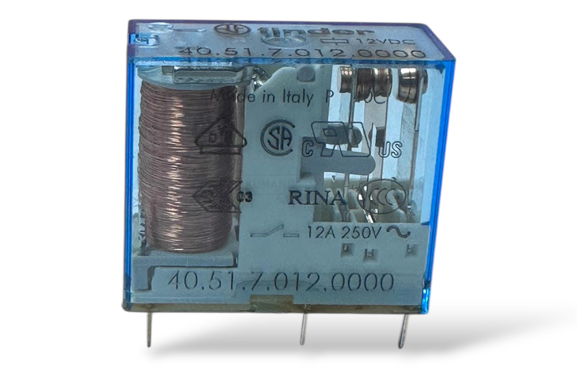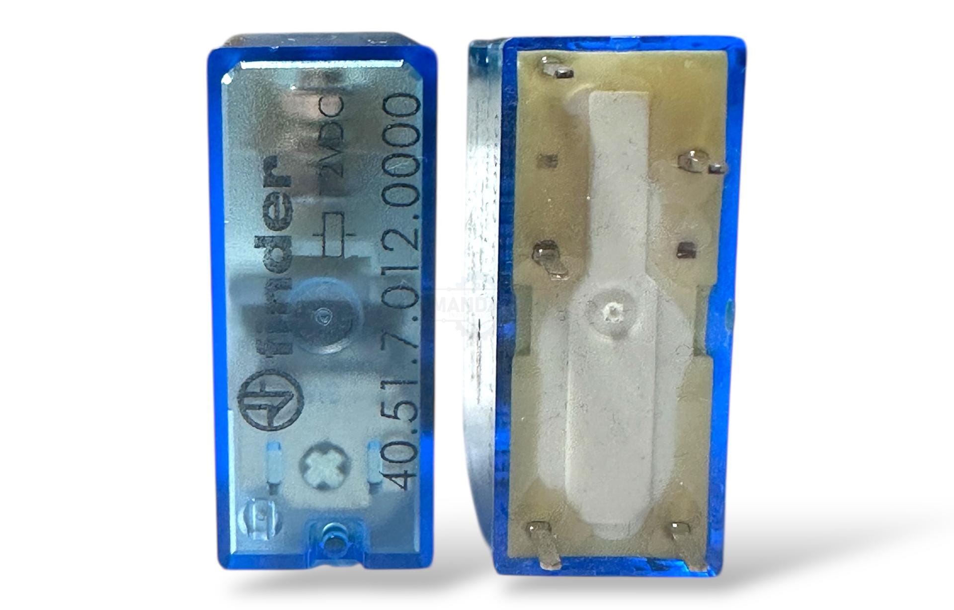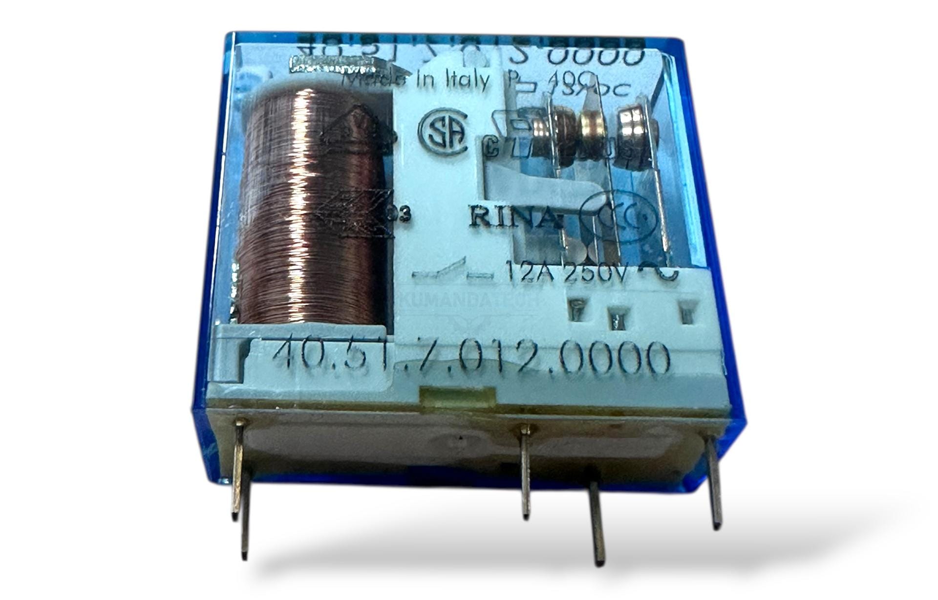 Finder 40.51.7.012.0000, 12V DC bobin gerilimine sahip, 1 değiştirici kontaklı (SPDT) ve 10A anahtarlama kapasiteli endüstriyel PCB rölesidir. Otomasyon, pano ve kontrol devrelerinde güvenilir anahtarlama sağlar.